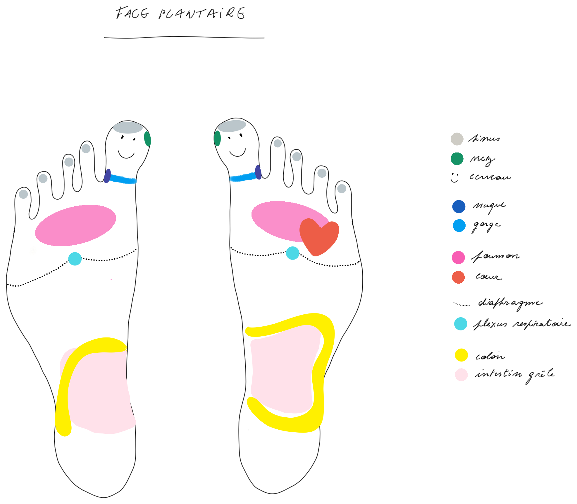Massage complet : du haut (orteils/sinus) vers le bas (gros intestin), en suivant le sens naturel du corps